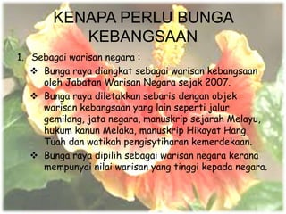 Pada akhir pada tahun 1958 Kementerian Pertanian telah mencadangkan tujuh jenis bunga untuk dipilih sebagai Bunga Kebangsaan Persekutuan Tanah Melayu iaitu Bunga Kenanga Bunga Raya Bunga Melur Bunga Teratai Bunga Mawar Bunga Cempaka dan Bunga Tanjung. Bunganya agak menonjol bilangannya sekuntum yang terletak di hujung tangkai yang panjang. Bunga Raya merupakan sejenis pokok renek berkayu dan mempunyai kulit kayu berwarna kelabu cerah.